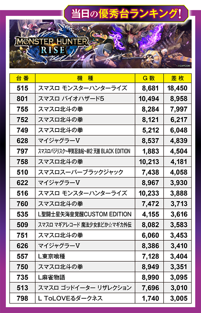 圧倒的な勢いでコンプリートを果たした『スマスロ モンスターハンターライズ』の515番台。この台ばかりに注目が集まりがちだが、2位以下にも強力な差枚レコードがズラリと並ぶ。特に『スマスロ北斗の拳』は3・4・5位の連続入賞を始め、計7台がランクイン!