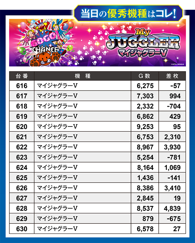 時にとんでもない差枚を叩き出す『マイジャグラーⅤ』だが、この日がまさにそれ。622番台と626番台が3,000枚オーバーを果たしただけでなく、628番台が4,800枚超えを実現。そこらのAT機を蹴散らすほどのポテンシャルを見せつけた。