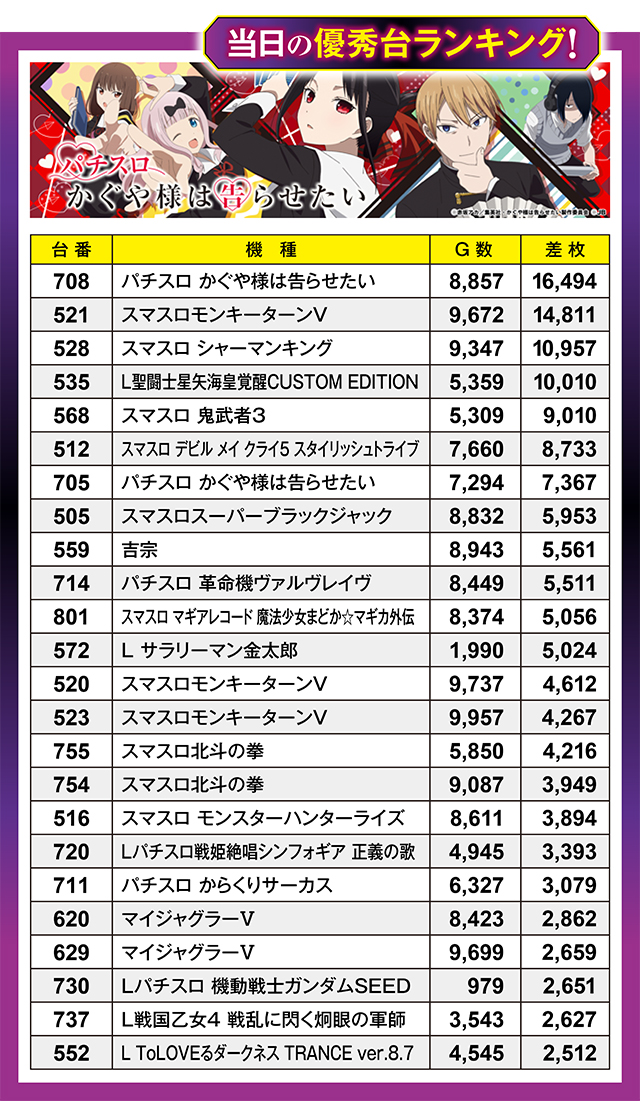 なんと4台もの10,000枚オーバー記録を生み出したこの日。1位の『パチスロ かぐや様は告らせたい』、2位の『スマスロモンキーターンV』などは想定内の結果だとして、バラエティー島に1台設置の『スマスロ シャーマンキング』、最近では差枚ランキングからすっかり名前の消えた『L聖闘士星矢海皇覚醒CUSTOM EDITION』がそれぞれ3・4位にランクインした事実に驚きが隠せない。