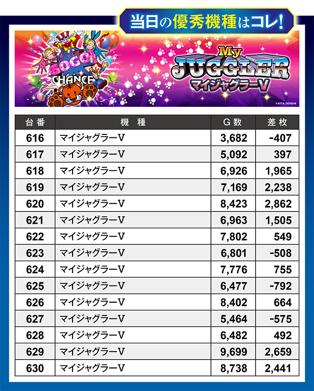 プラス台の多さもさることながら、1,500枚を上回る差枚結果を計6台も生み出すことに成功!前回のように4,800枚を超える尖った記録がなかった代わりに、全体的に安定していた印象が強い。