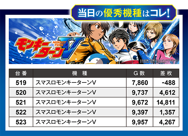 マイナス台は1台のみ、加えて4,000枚オーバーが2台、14,000枚オーバーが1台と、文句なしの暴れっぷりを披露!まだまだ『スマスロモンキーターンV』は現役最前線で戦う機種!