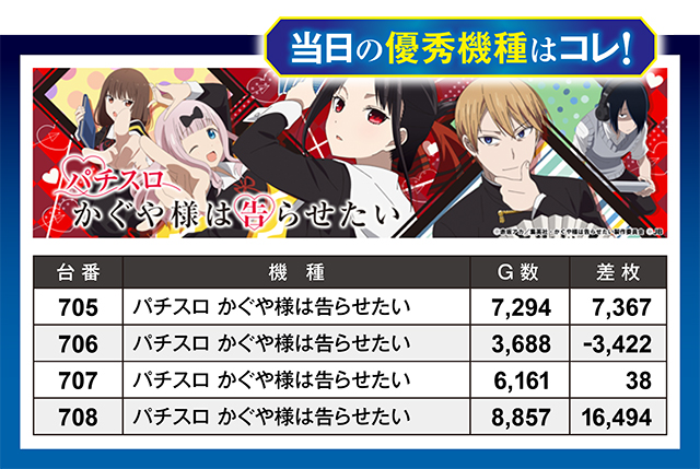 708番台が凄まじい勢いで16,000枚を突破!かと思えば705番台も7,000枚を突破する優秀結果を見せてくれた。そんな良質な台たちに挟まれた706・707番台の結果が悔やまれる…。