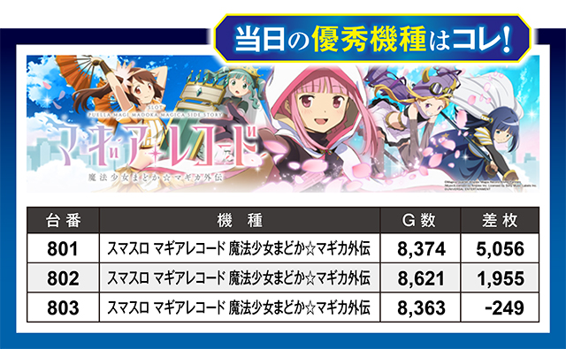 残念ながら僅差で803番台がマイナスになってしまい、全台プラスの栄光を逃してしまった『スマスロ マギアレコード 魔法少女まどか☆マギカ外伝』。しかしそれを補うかのように、801番台が好挙動のまま5,000枚超えを達成した。