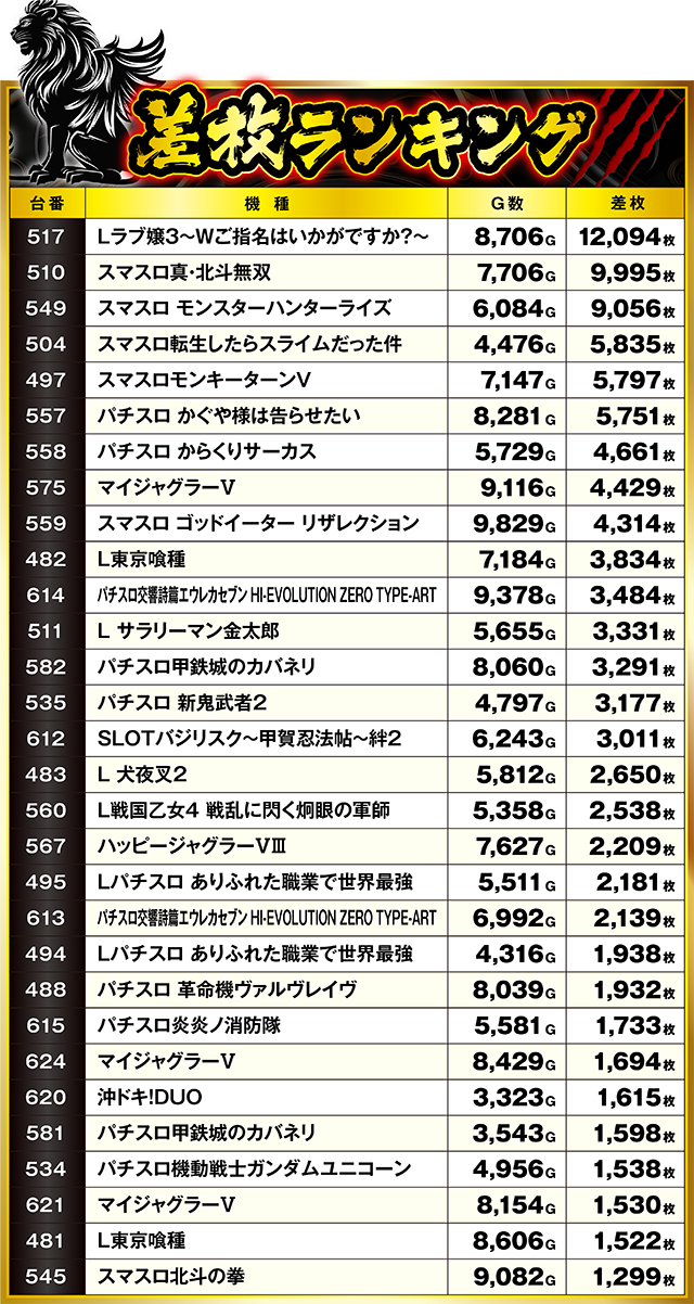 12,000枚オーバーを達成した『Lラブ嬢3~Wご指名はいかがですか?~』が、この日の最高差枚記録となった今回。2位にはあと5枚で10,000枚に到達した『スマスロ真・北斗無双』。1・2位を意外な機種が占めることとなった。なお、今回の5,000枚超え台数は前回の倍!