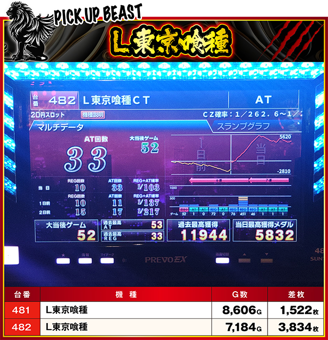 2台設置の『L東京喰種』は、揃ってプラスでフィニッシュ!ともに良好な挙動を見せ、最終的には482番台が4,000枚に迫る好記録を生み出した。