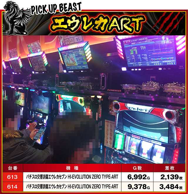 前回も設置2台がプラっていた『パチスロ交響詩篇エウレカセブン HI-EVOLUTION ZERO TYPE-ART』は、この日も2台ともがプラスに。前回よりも多く回されていたせいか、差枚の方も前回よりUP!もしや『エウレカART』は2連続で…!?