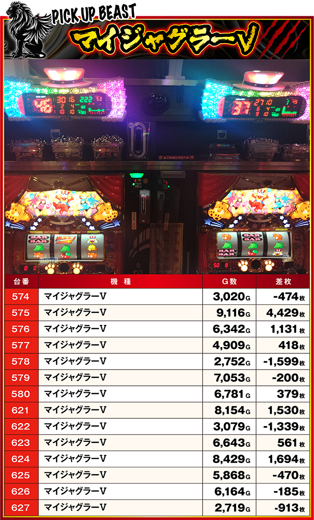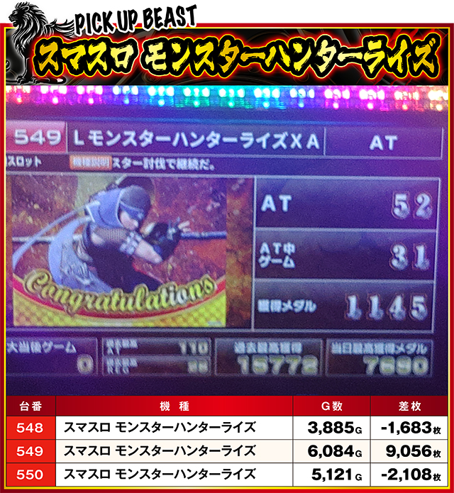 前回と同じく、またしても3台中2台がマイナスとなってしまった『スマスロ モンスターハンターライズ』だが、前回と大きく異なるのは、唯一のプラスである549番台が9,000枚オーバーを果たしたこと。明らかに優秀台ムーブを見せていた549番台が見せ場を作ってくれた。