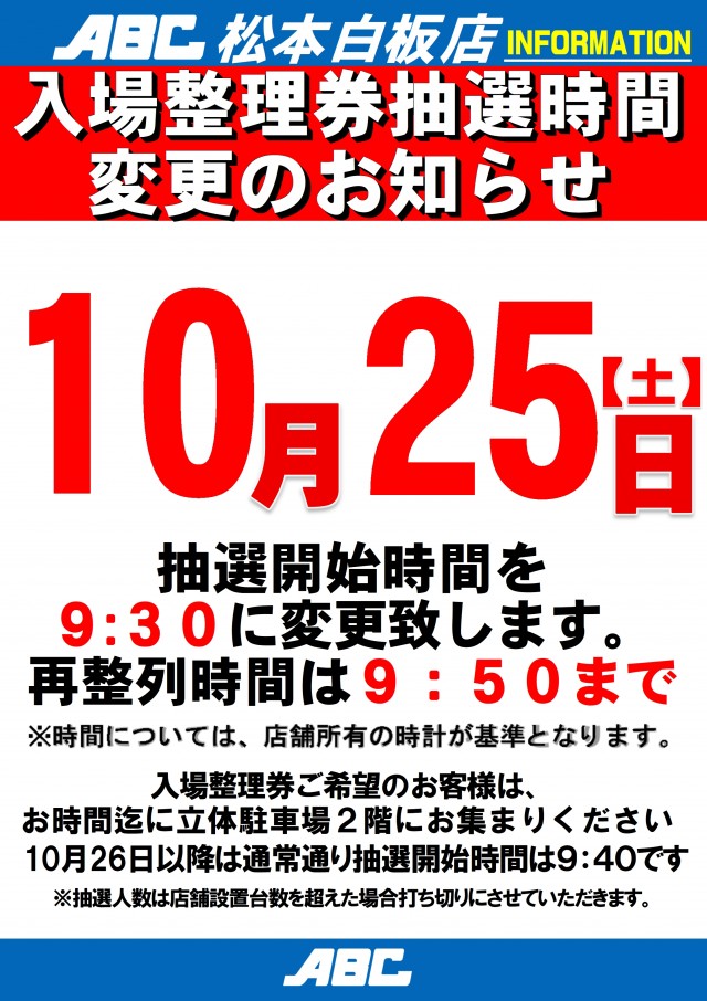 9:40までに立体駐車場2階にお並び頂いたお客様を対象に、入場抽選を行います また、入場時に遊技台確保券をお渡しいたします |