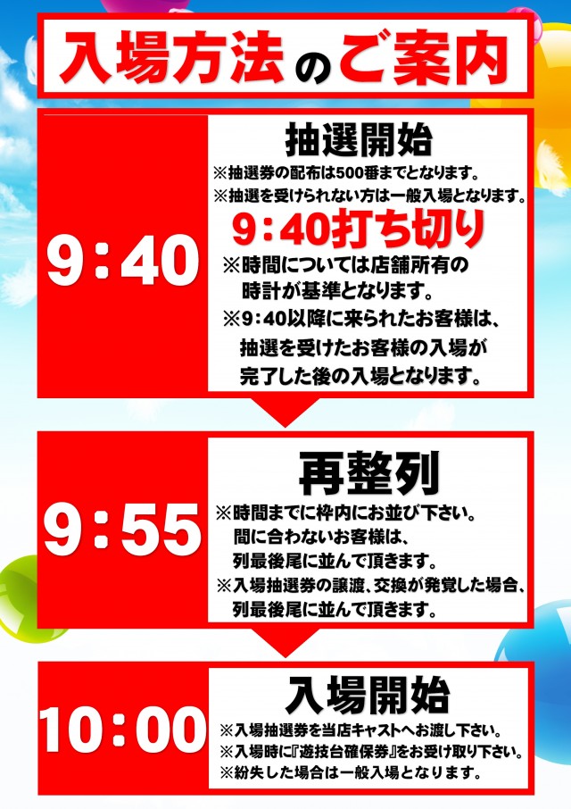 9:40までに立体駐車場2階にお並び頂いたお客様を対象に、入場抽選を行います また、入場時に遊技台確保券をお渡しいたします |