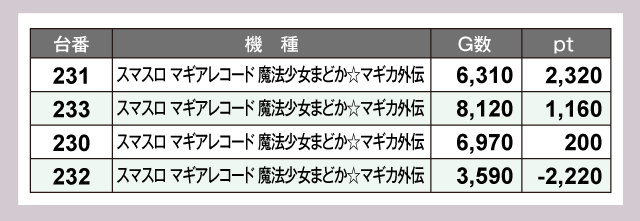 4台設置の『スマスロ マギアレコード 魔法少女まどか☆マギカ外伝』は3台がプラスで、15台設置の『マイジャグラーⅤ』は8台がプラス。どちらもプレイヤーが夢中でレバーを叩く姿が見られた。