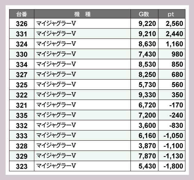 ひときわ目立った成績を残したのは『吉宗』。193番台が+14,460ptで1万ptをはるかに超える結果を残した。ついで『L ダーリン・イン・ザ・フランキス』277番台が+8,680pt、『L 東京喰種』198番台が+7,000pt、『L ToLOVEるダークネス』214番台が+6,290ptの好結果を叩きだしている。さらに『スマスロ北斗の拳』258番台の+5,860pt、249番台の+5,480ptと、優秀台がズラリと詰まった見応えバツグンのデータが仕上がっていた。