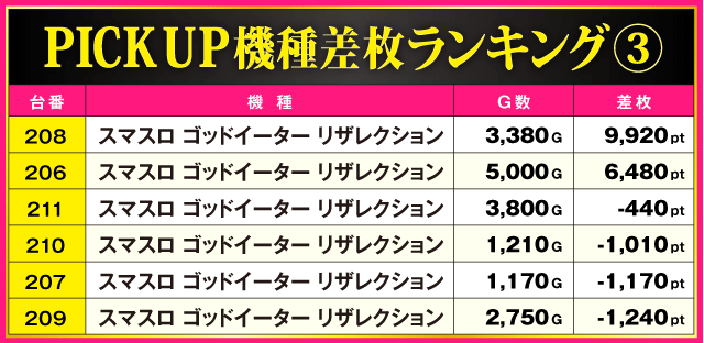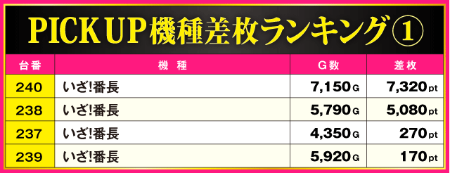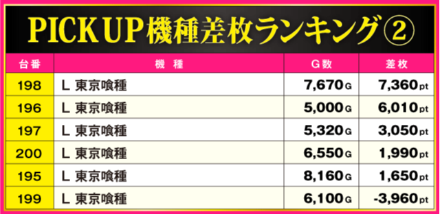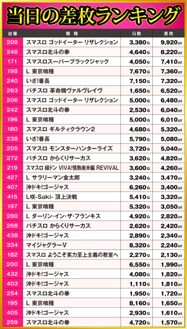 今回のPICK UP機種は全3機種。差枚上位にランクインした台以外からも好成績が続出しており、『スマスロ ゴッドイーター リザレクション』と『L 東京喰種』からは+6,000pt超、『いざ!番長』からは+5,080ptが発生している。さらに、3機種トータルの全16台中11台がプラス差枚となっているだけに、それぞれのシマは常に活気に満ち溢れる一日となった。