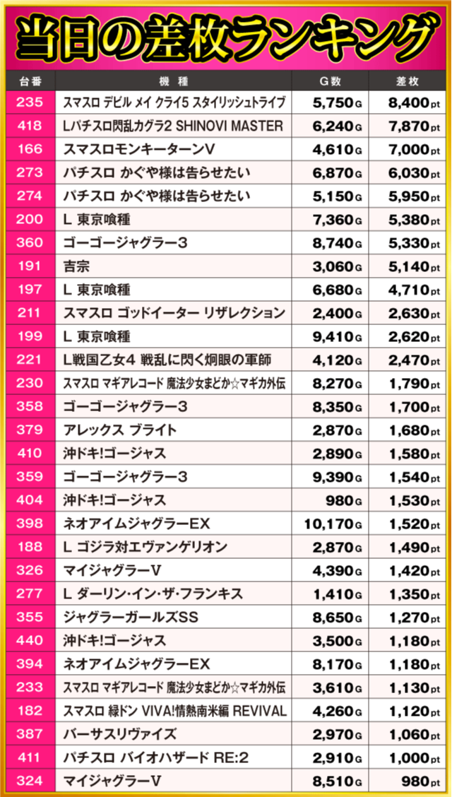 この日は、人気のスマスロを中心に多数の好調台を確認。そんな中、『スマスロ デビル メイ クライ5 スタイリッシュトライブ』が+8,400ptを叩き出しランキングトップに。次いで『Lパチスロ閃乱カグラ2 SHINOVI MASTER』と『スマスロモンキーターンV』が+7,000pt超を記録し店内を盛り上げていた。