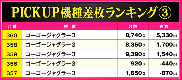 今回のPICK UP機種は全3機種。ハイスコアを記録した『スマスロ デビル メイ クライ5 スタイリッシュトライブ』以外にも、『パチスロ かぐや様は告らせたい』から+6,030pt、『ゴーゴージャグラー3』から+5,330ptといった好成績が発生。さらに、3機種トータルの全12台中7台がプラス差枚となる見事な結果を残している。
