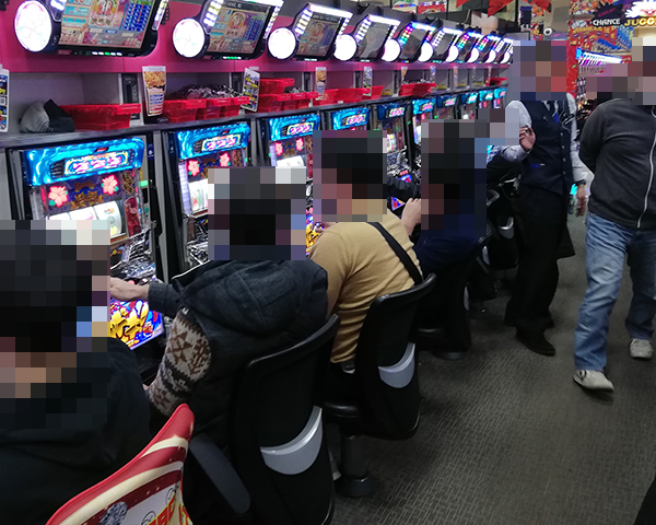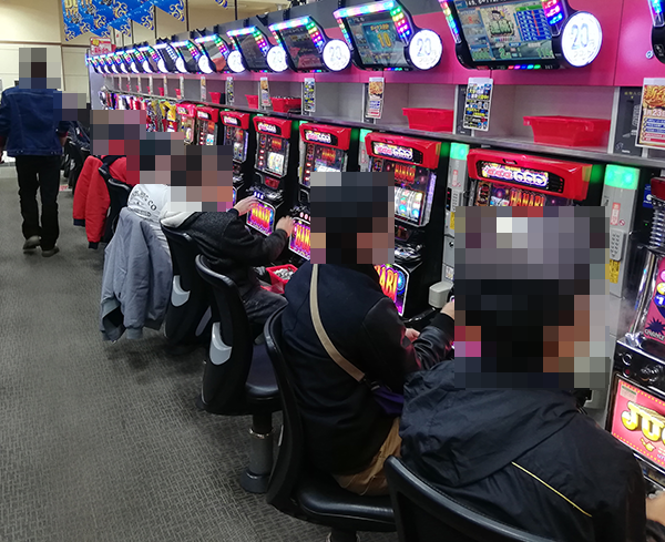 16時頃の20円パチスロをみると、「沖ドキ!」と「ミリオンゴッド-神々の凱旋-」がひときわにぎやか。ほとんどのプレイヤーが満面の笑みを浮かべており、機種の魅力を味わえているように思えた。