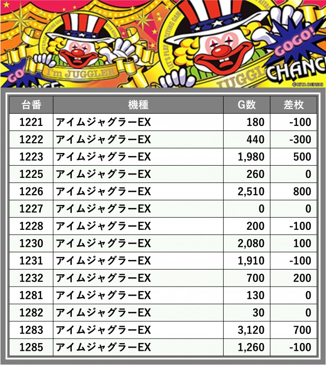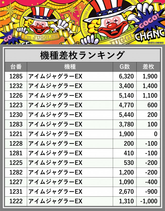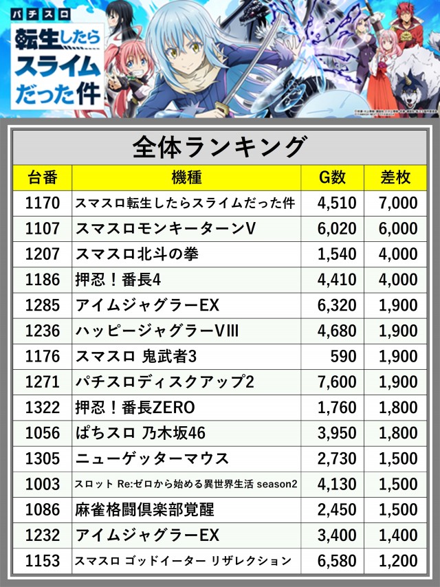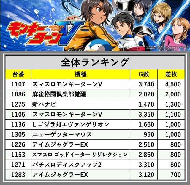 厳選された取材対象機種をはじめ、その他スロット全体から好記録が飛び出した!プレイヤーが楽しんだ1日を下記データにて振り返ってみて欲しい。