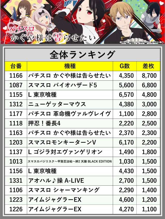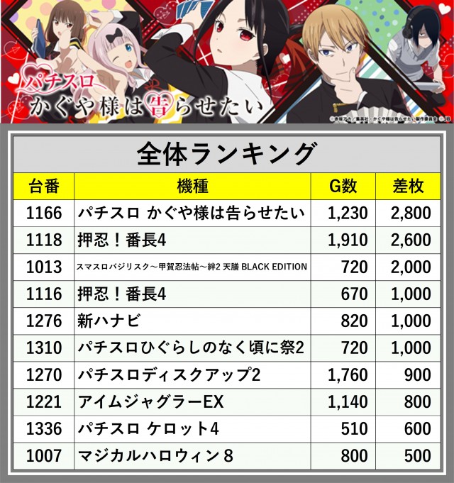 ※差枚数順に掲載しています