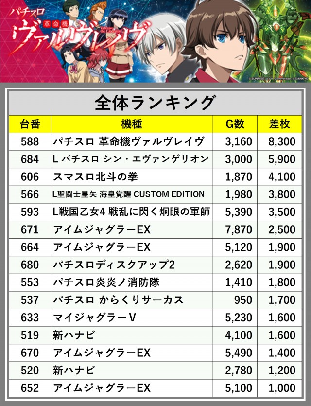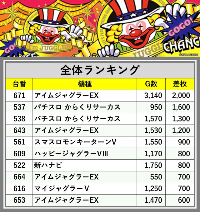 厳選された取材対象機種をはじめ、その他スロット全体から好記録が飛び出した!プレイヤーが楽しんだ1日を下記データにて振り返ってみて欲しい。