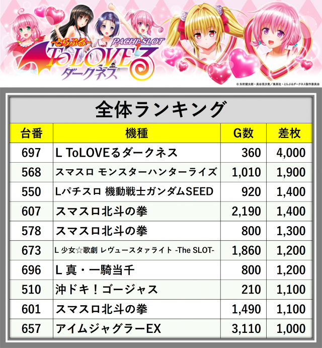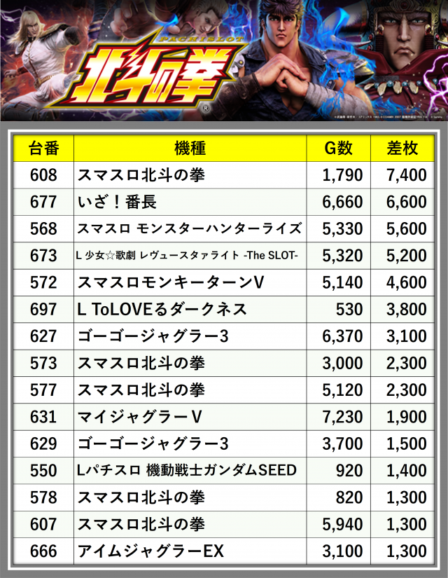 ※差枚数順に掲載しています