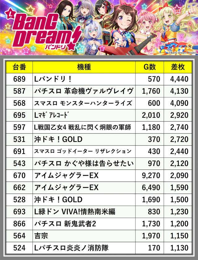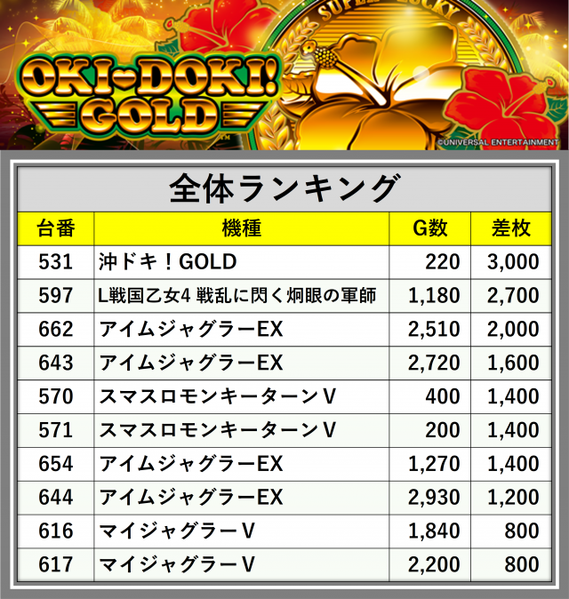 厳選された取材対象機種をはじめ、その他スロット全体から好記録が飛び出した!プレイヤーが楽しんだ1日を下記データにて振り返ってみて欲しい。