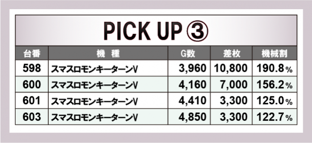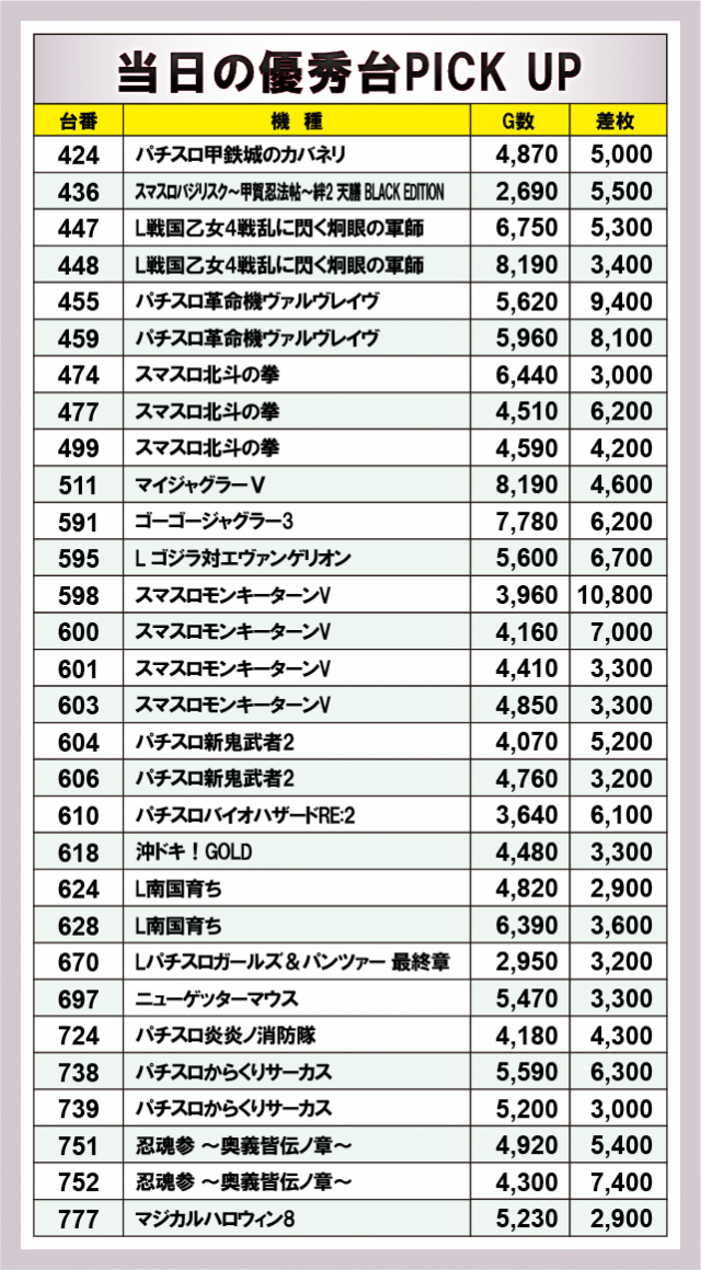 まずは優秀台30台の紹介から。30台すべてが+2,000枚オーバーを記録!+3,000枚オーバーは30台のうち28台、さらに+5,000枚オーバーは15台出現!それらのなかでもっとも優秀だったのは、598番台の「スマスロモンキーターンV」で、大台突破の差枚+10,800枚を獲得! またランクイン台を詳しく見てみると、スマスロを中心に6.5号機、ノーマルタイプまで様々な種類の機種がランクインし、幅広い機種にチャンスが隠されていたようだ!