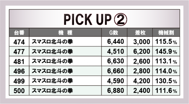 続いては、当日とくに賑わいを見せた3機種を紹介していこう。まず「パチスロ革命機ヴァルヴレイヴ」は、455番台+9,400枚や459番台+8,100枚といった好記録を打ち立てた。次いで「スマスロ北斗の拳」は、477番台+6,200枚をはじめとしてピックアップ6台の平均差枚は+3,533枚とアベレージの高い結果をマークし、手応えのほどを窺うことができた。そして「スマスロモンキーターンV」は、当日のトップ差枚を獲得した598番台+10,800枚を筆頭に、ピックアップ4台の平均差枚が+6,100枚とこちらも素晴らしい記録を残していた!