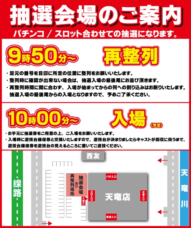 【パチンコ・スロット】入場抽選参加券配布終了及び入場抽選会開始:AM9:40~ |
