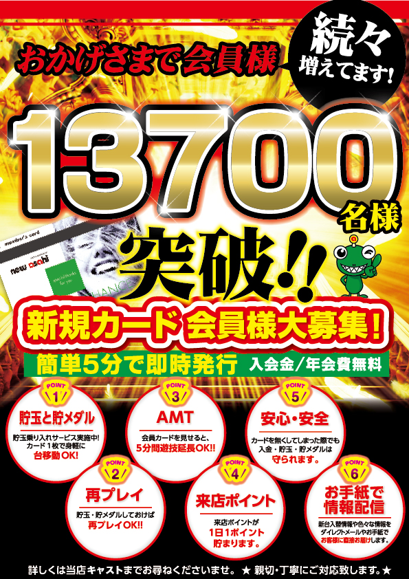 AM10:00~22:45 会員カードをお持ちのお客様は5分の延長ご遊技が可能です。 |