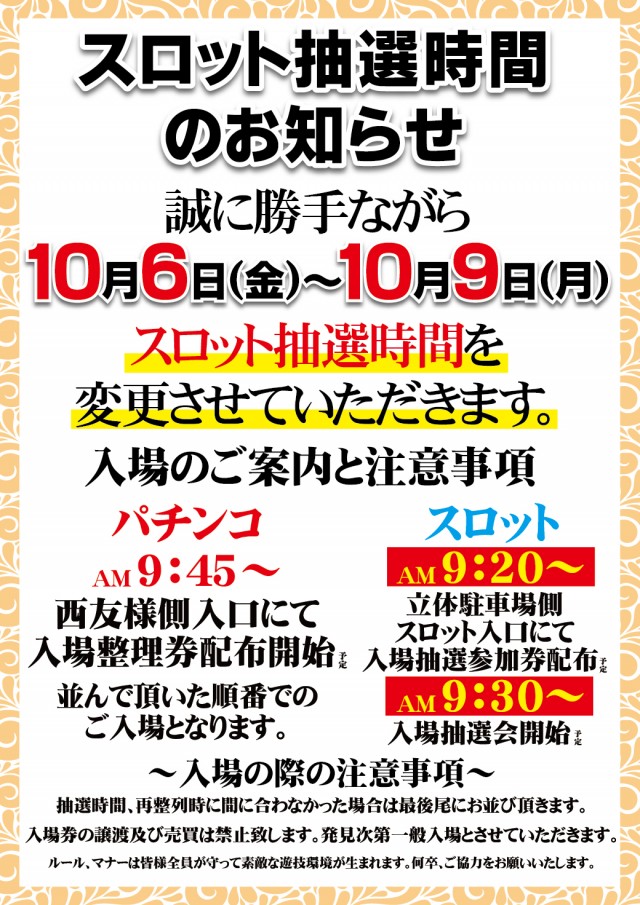 【パチンコ・スロット】入場抽選参加券配布終了及び入場抽選会開始:AM9:40~ |