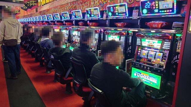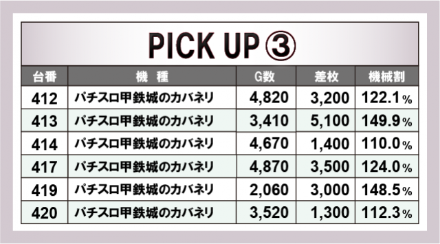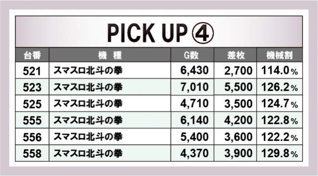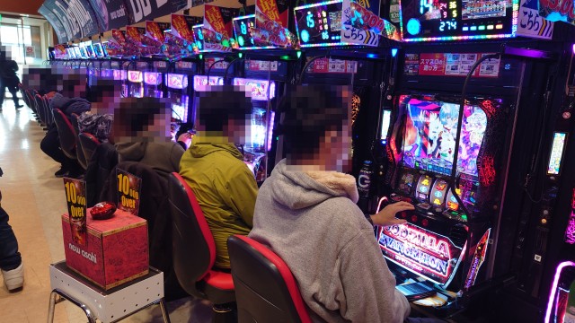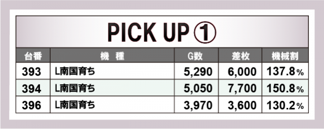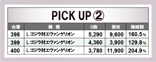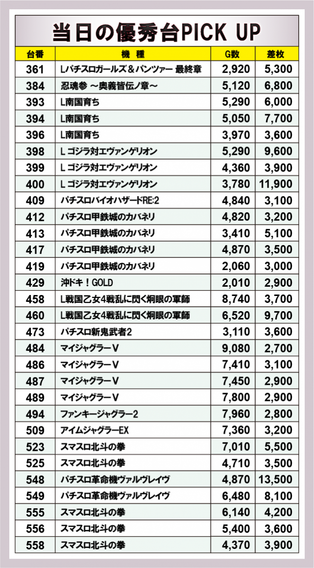 続いては、当日とくに盛り上がっていた4機種を紹介していこう。まず「L南国育ち」は、ピックアップ3台の平均差枚が+5,766枚と当日トップクラスの好成績をマーク! 続いて「L ゴジラ対エヴァンゲリオン」は、400番台の+11,900枚で万枚オーバーを記録。398番台の+9,600枚も大台突破に迫る勢いで、設置全台で好調ぶりを発揮していた。さらに、6.5号機の人気機種「パチスロ甲鉄城のカバネリ」では、413番台の+5,100枚を筆頭に6台の平均差枚は2,916枚をマーク。そして、不動の人気機種「スマスロ北斗の拳」では、ピックアップ6台のうち5台が+3,000枚オーバーを獲得し、平均差枚も+3,900枚と好記録をマーク。これらの機種たちが当日の盛り上がりを牽引していたのは間違いなさそうだ!