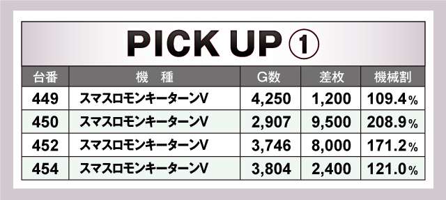 続いては、当日とくに盛り上がっていた2機種を紹介していこう。2機種どちらのピックアップ平均差枚はなんと+5,000枚超えと凄まじい盛り上がりで、+7,000枚オーバーも7台のうち4台と好調台が多数出現! これら2機種の活躍を筆頭に、多くの人気機種にも良台を多数確認することができた!