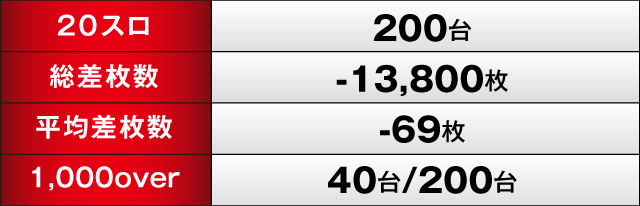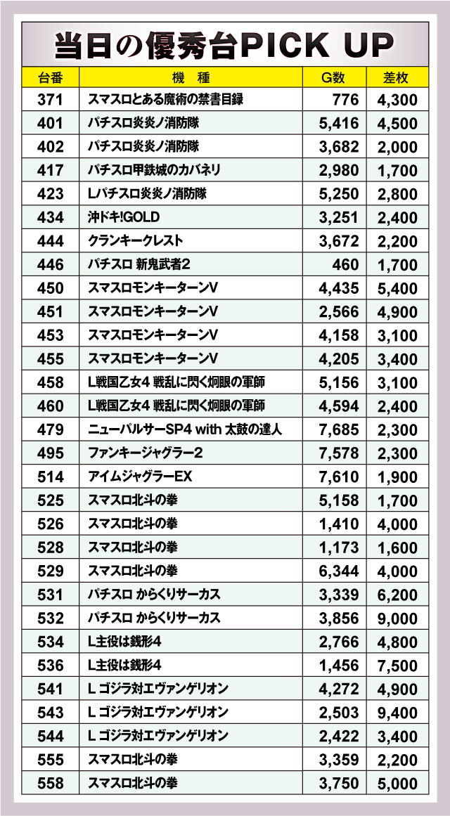 まずは優秀台30台を紹介していこう。30台のうち25台が差枚+2,000枚を超えており、+3,000枚超えは17台出現。それらのなかでもっとも優秀だったのは、543番台の「L ゴジラ対エヴァンゲリオン」で、差枚+9,400枚を獲得! また優秀台全体を見渡すと、スマスロを中心に多くの機種から好記録を確認できたことから、幅広い機種にチャンスが隠されていた可能性が高そうだ!