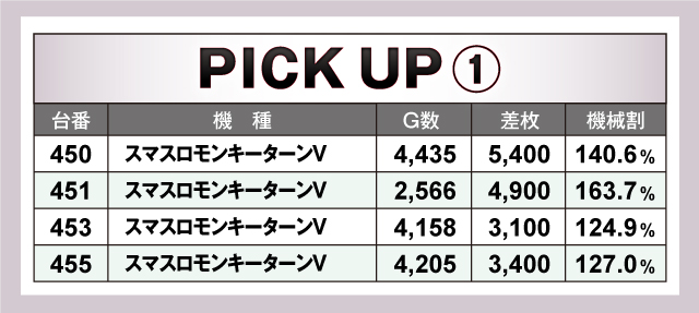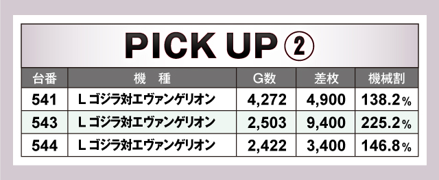 続いては、当日とくに店内を盛り上げた2機種を紹介していこう。まず優秀台ピックアップ30台のうち4台がランクインした「スマスロモンキーターンV」は、並びではないもののほぼカタマリで好記録が複数出現し、平均差枚は+4,200枚と好記録をマーク! 続いて優秀台も輩出した「L ゴジラ対エヴァンゲリオン」は、ピックアップ3台の平均差枚+5,900枚とこちらも素晴らしい結果を残していた!