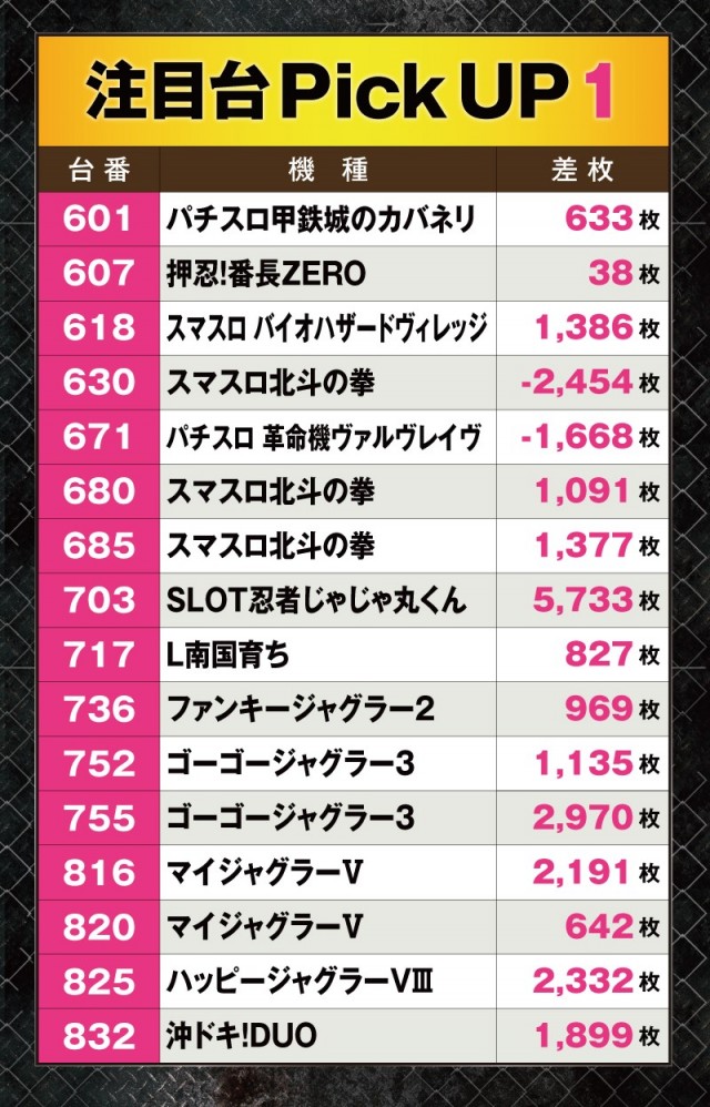 なかでも最新台の『SLOT忍者じゃじゃ丸くん』が活況で、+5,733枚と機種性能をフルに発揮している。