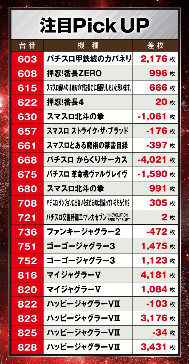 今回はジャグラーシリーズの好調台が特に目に付く結果となった「ニューシンセイ」。次回のブラックデビルズ降臨の際も、是非この結果を参考にしてチャンスを掴んでほしい。