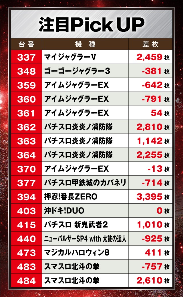 『押忍!番長ZERO』では+3,395枚、『スマスロ北斗の拳』は+2,610枚、『マイジャグラーⅤ』は+2,459枚と活気あるシーンを目にしている。