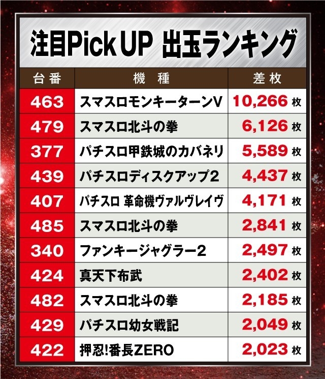 この日は、スマスロをはじめAT機にAタイプにと、様々な機種がランキングの上位を占めた。なかでも注目となったのが『スマスロモンキーターンV』で、夢の万枚超に成功する見事な結果を残している。