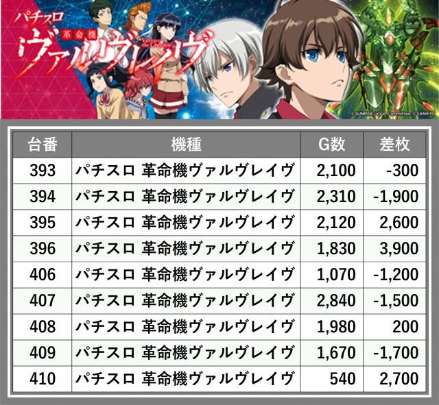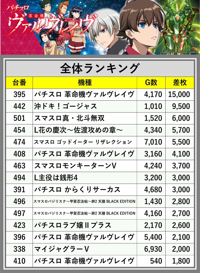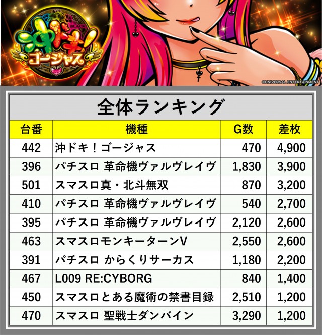 厳選された取材対象機種をはじめ、その他スロット全体から好記録が飛び出した!プレイヤーが楽しんだ1日を下記データにて振り返ってみて欲しい。