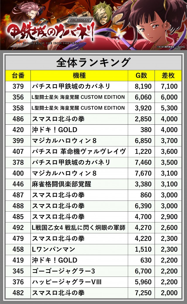 厳選された取材対象機種をはじめ、その他スロット全体から好記録が飛び出した!プレイヤーが楽しんだ1日を下記データにて振り返ってみて欲しい。