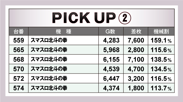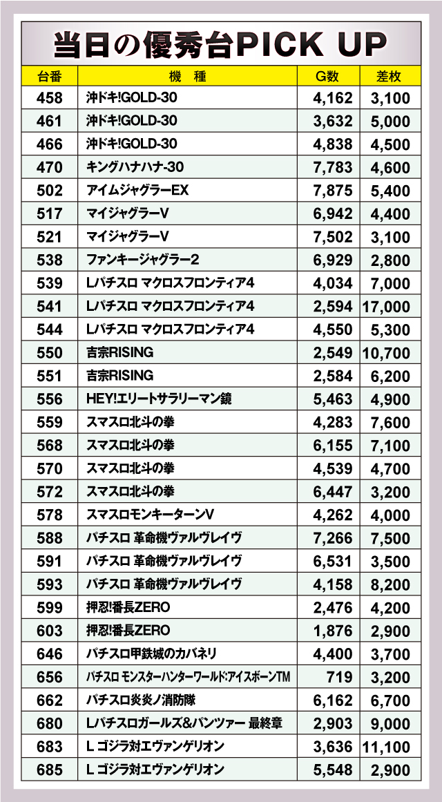 まずは優秀台30台のチェックから。30台全てが+2,000枚オーバーで、+5,000枚オーバーは30台のうち約半数の14台出現。それらのなかでもっとも優秀だったのは、541番台の「Lパチスロ マクロスフロンティア4」で、差枚+17,000枚の圧倒的プラスをマーク! その他+10,000枚オーバーは2台出現しており、これだけ見てもどれだけ盛り上がりを見せていたかが分かってもらえるハズ。また、優秀台全体をチェックすると、スマスロが大半を占めるなかノーマルタイプも5台ランクインしていたので、こちらも要チェックだ!