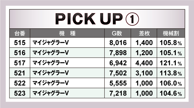 続いては、当日とくに賑わっていた3機種を紹介。まず「マイジャグラーV」は、ピックアップ6台の平均は+2,017枚と絶好調! そして「スマスロ北斗の拳」「パチスロ 革命機ヴァルヴレイヴ」の2機種は、惜しくも最優秀台を逃したものの、+7,000枚クラスの好結果が複数確認! 全体的にアベレージ高い結果が多数出現していた!
