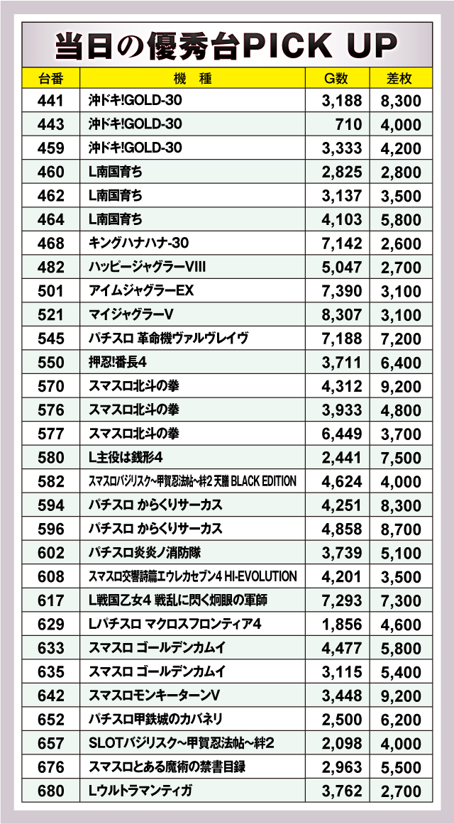 まずは優秀台30台の紹介から。30台すべてが+2,000枚オーバーで、+3,000枚オーバーは26台出現。それらのなかでもっとも優秀な成績を収めたのが、570番台の「スマスロ北斗の拳」と642番台の「スマスロモンキーターンV」の2台で、どちらも差枚+9,200枚を獲得! またランクイン台を詳しく見てみると、「スマスロ北斗の拳」や「沖ドキ!GOLD-30」「L南国育ち」など、特定の機種から複数台がランクイン! チャンスは特定機種に固まっていた可能性が高そうだ!