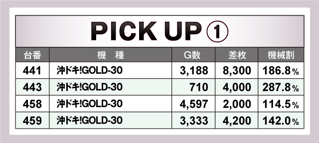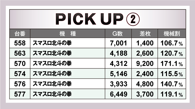 続いては、当日とくに賑わいを見せた2機種を紹介していこう。まず「沖ドキ!GOLD-30」は、惜しくも最優秀台を逃した441番台の+8,300枚を筆頭に好記録が連発! ピックアップ4台の平均差枚は驚異の+4,625枚と素晴らしい結果をマーク! 続いて「スマスロ北斗の拳」は、最優秀台の570番台を筆頭にピックアップ6台すべてが4ケタオーバーで、平均差枚+4,017枚とこちらも絶好調! これら2機種が当日の盛り上がりを牽引していたことは間違いなさそうだ!