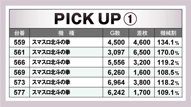 続いては、当日特に盛り上がっていた「スマスロ北斗の拳」を紹介しよう。今回ピックアップしたのは6台で、6台のうち4台が差枚+3,000枚オーバー! また平均差枚も素晴らしく、+3,567枚と他を圧倒する好記録をマーク! 優秀台30台の中に4台がランクインしていたことからも、当日もっとも店内を賑やかした機種で間違いないだろう!