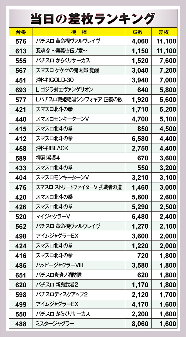 まずは優秀台30台のチェックから。30台のうち22台が+2,000枚オーバーを記録し、+5,000枚オーバーは9台出現! それらのなかでもっとも優秀だったのは、576番台の「パチスロ 革命機ヴァルヴレイヴ」と613番台の「忍魂参 ~奥義皆伝ノ章~」の2台で、どちらも差枚+11,100枚と素晴らしい記録をマーク! その他ランクイン機種には、「スマスロ北斗の拳」を筆頭にスマスロ機種が多数ランクイン。またジャグラーシリーズもランクインしていたので、ハイスペック機種からノーマルタイプまで幅広い機種にチャンスがあったようだ!