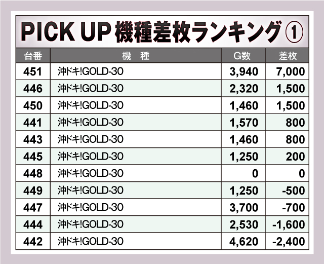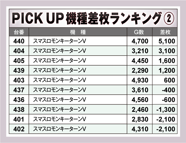 続いては、当日とくに盛り上がっていた2機種を紹介。まず「沖ドキ!GOLD-30」は、ピックアップした11台のうち6台がプラス終了しており、そのうち3台が4ケタオーバーをマーク! 続いて「スマスロモンキーターンV」は半数の5/10台がプラス終了で、そのうち4台が4ケタオーバーとこちらも素晴らしい成績を残していた!
