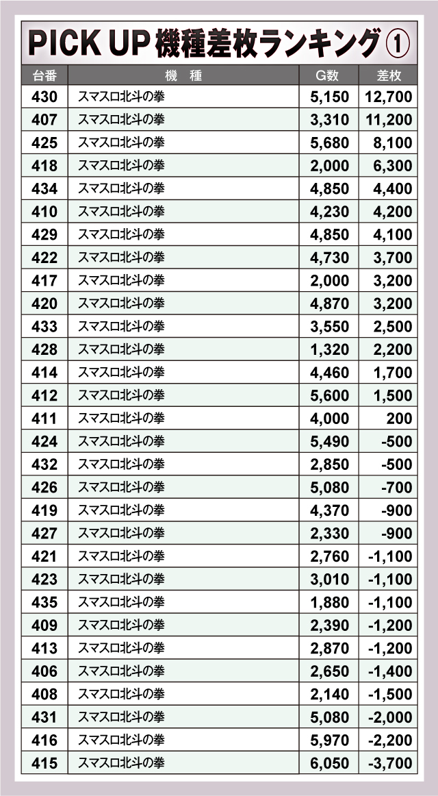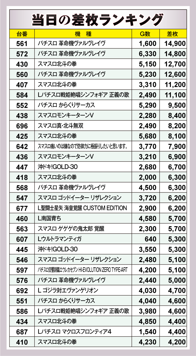 まずは差枚ランキングのチェックから。なんと30台すべてが差枚+4,000枚オーバーで、大台突破の+10,000枚オーバーは6台も出現と圧倒的! それらのなかでもっとも優秀だったのは、561番台の「パチスロ 革命機ヴァルヴレイヴ」で、差枚は+14,900枚を獲得! またランクイン機種を見渡してみると、人気のスマスロから最新機種まで多種多様な機種がランクイン! この結果を見ただけでも、当日かなりの盛り上がりだったことが分かるハズだ!