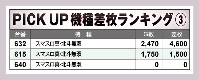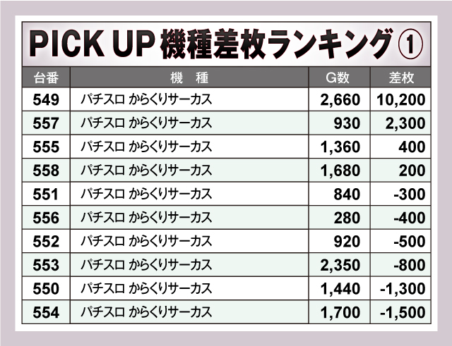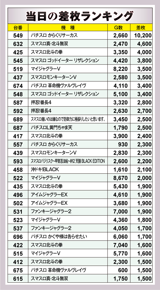 まずは差枚ランキングのチェックから。30台のうち18台が差枚+2,000枚オーバーで、+3,000枚オーバーは8台出現。それらのなかでもっとも優秀だったのは、549番台の「パチスロ からくりサーカス」で、差枚は+10,200枚を獲得! またランクイン機種を見渡してみると、人気のスマスロ機種やジャグラーシリーズが多数ランクイン! ファンが好む機種を中心に楽しめる環境が用意されていたようだ!