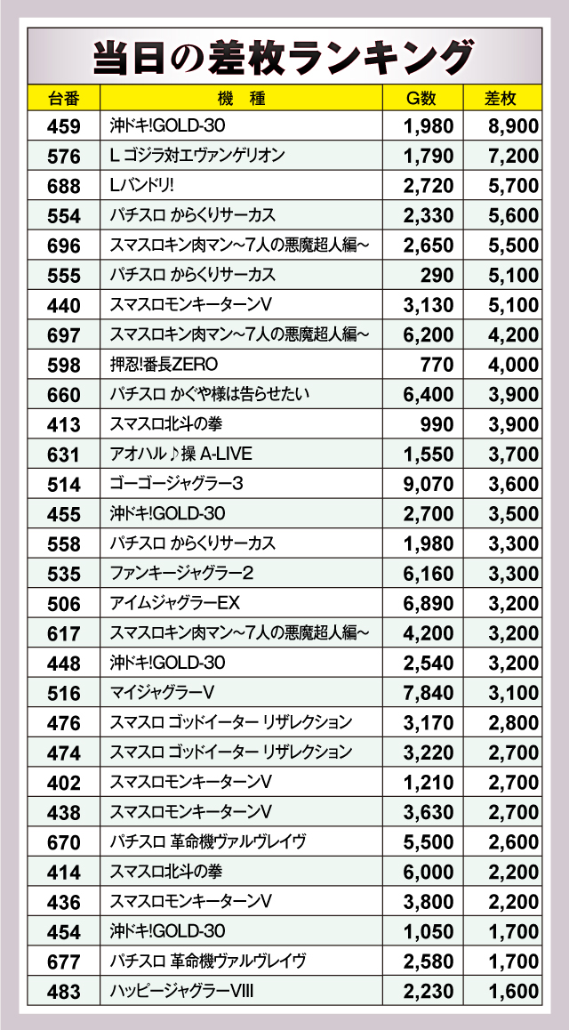 まずは差枚ランキング30台のチェックから。30台のうち27台が+2,000枚オーバーを記録し、+3,000枚オーバーは20台出現! それらのなかでもっとも優秀だったのは、459番台の「沖ドキ!GOLD-30」で、差枚は+8,900枚と素晴らしい記録をマーク! その他ランクイン機種には、人気スマスロ機種をはじめジャグラーシリーズや最新機種など、店内のあらゆる機種にチャンスがあったようだ!