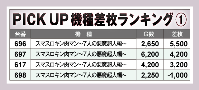 続いては、当日とくに盛り上がっていた3機種を紹介。3機種とも好記録がてんこ盛りで、それらのなかでも「スマスロキン肉マン~7人の悪魔超人編~」は、ピックアップ4台のうち3台が差枚+3,000枚オーバーと素晴らしい結果を残していた。もちろんその他2機種を含め、店内全体が活気に溢れていた!